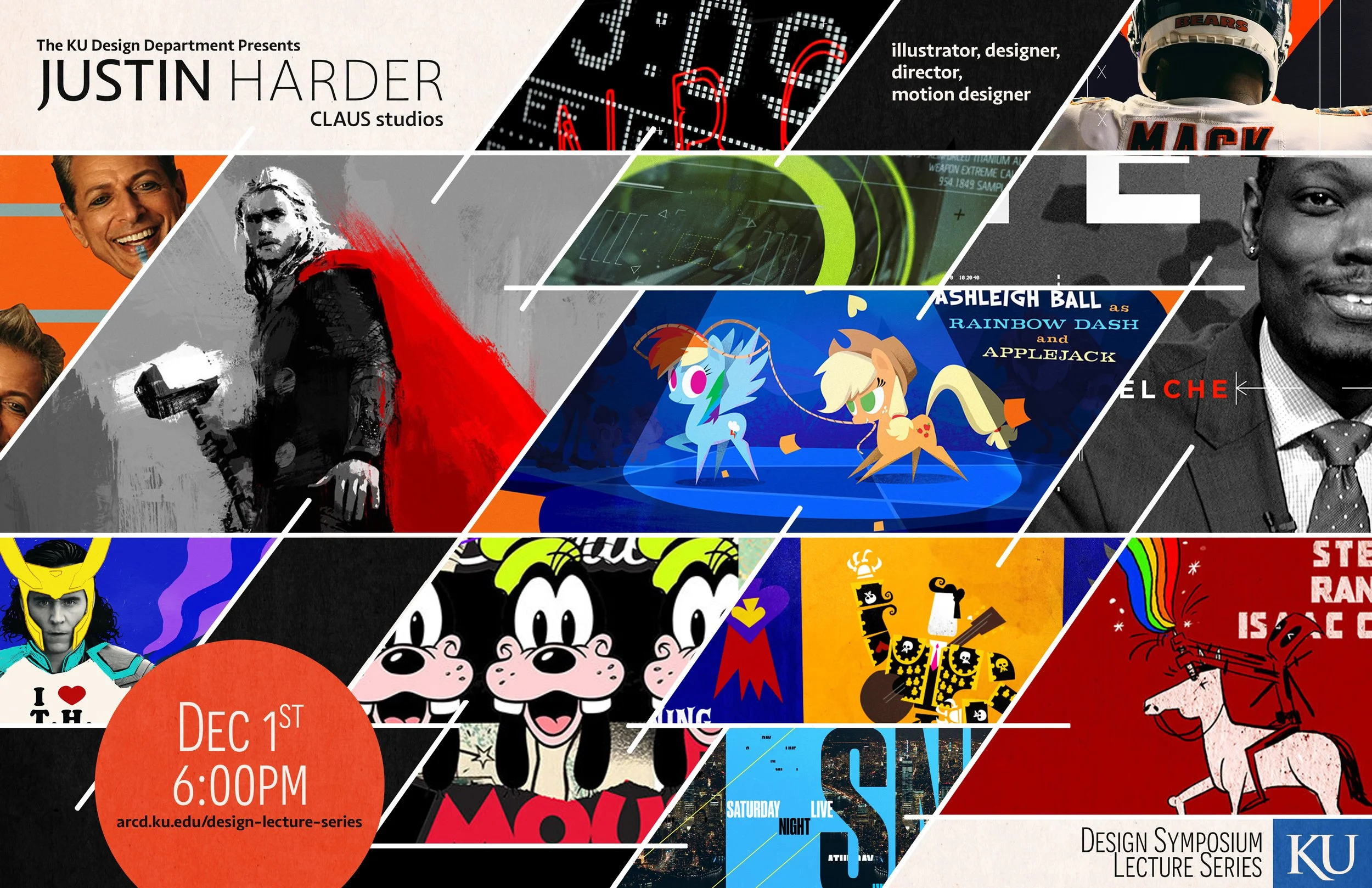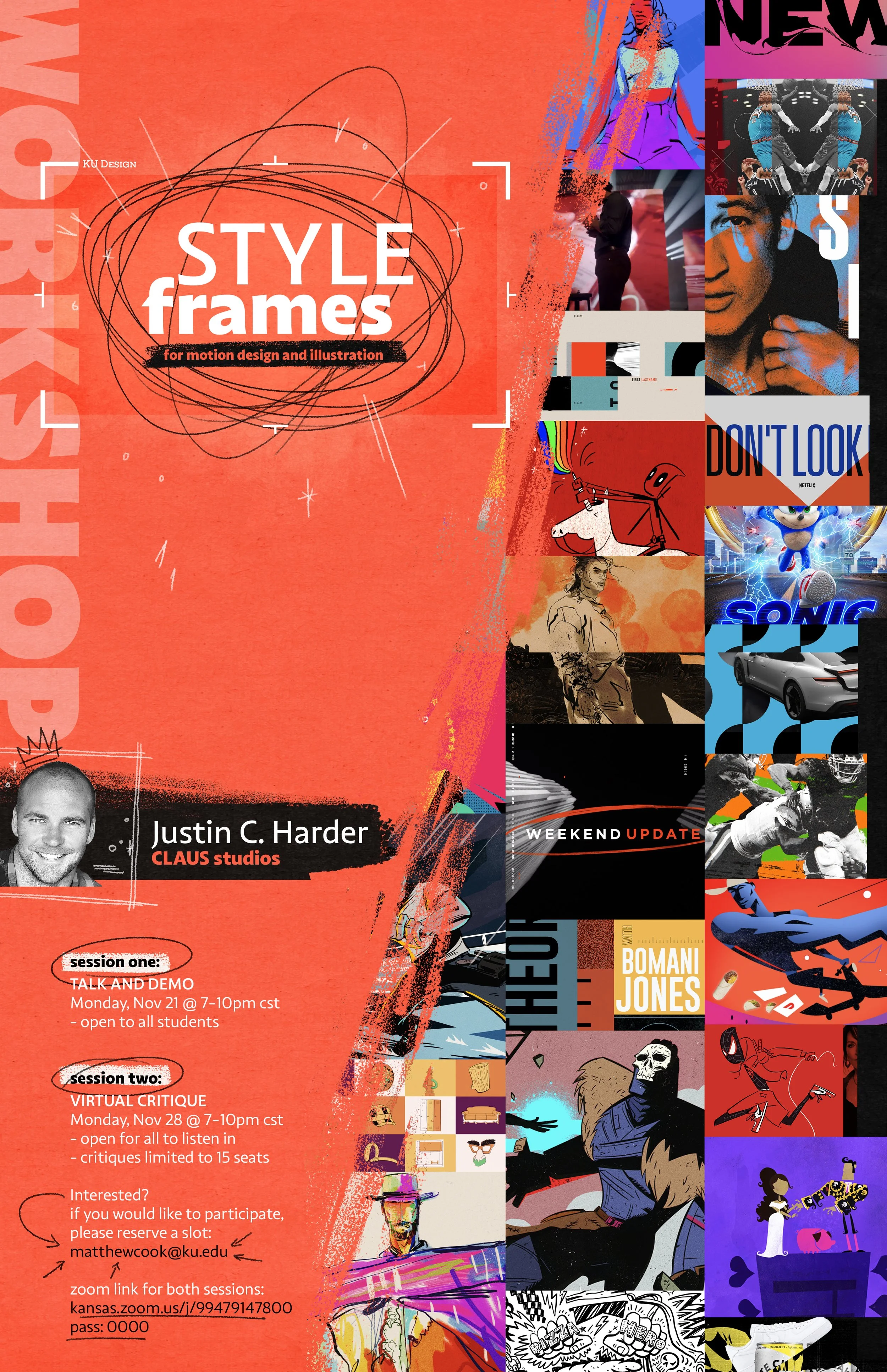 In December of 2022 we were lucky enough to have the talented motion designer and illustrator Justin Harder speak as a guest at the school’s Design Symposium Lecture Series. I designed posters both for Justin’s talk, as well as a workshop on designing style frames.