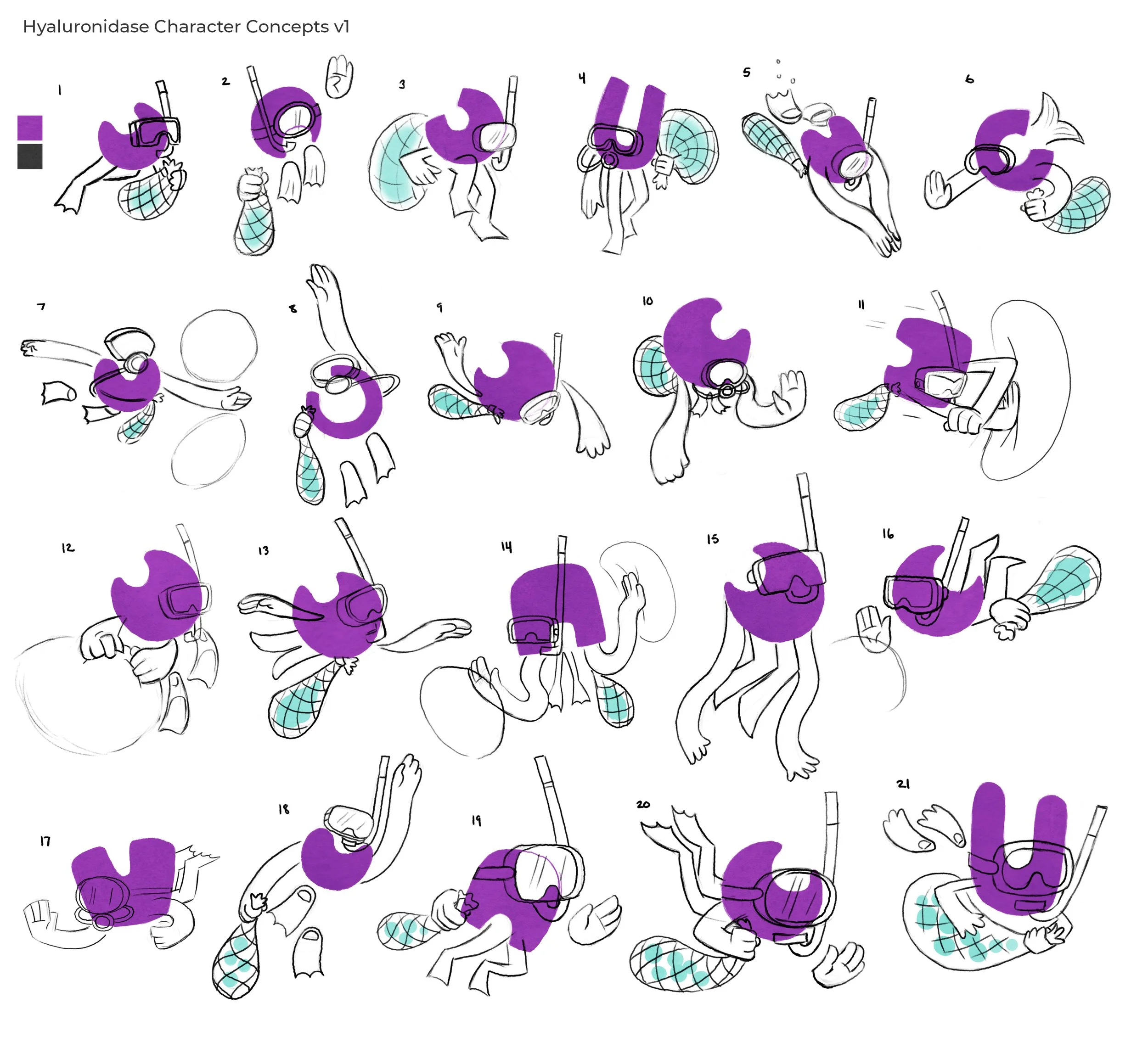 The character was designed as a simple shape to match with the already established aesthetic of the animated explainer. The character is designed to resemble a skin diver carrying a mesh bag that contains the Vyvgart medication it will deliver.